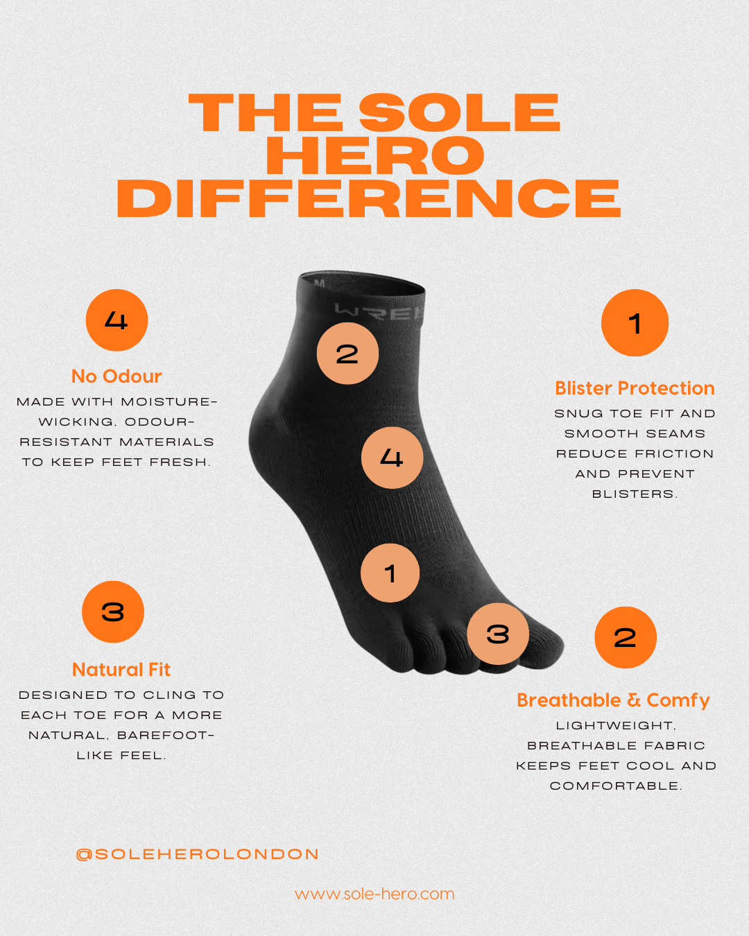 Meet Our Performance Socks - the ultimate comfort for your feet! Designed fit any foot size or shape! The toe separation reduces friction and protects your skin!